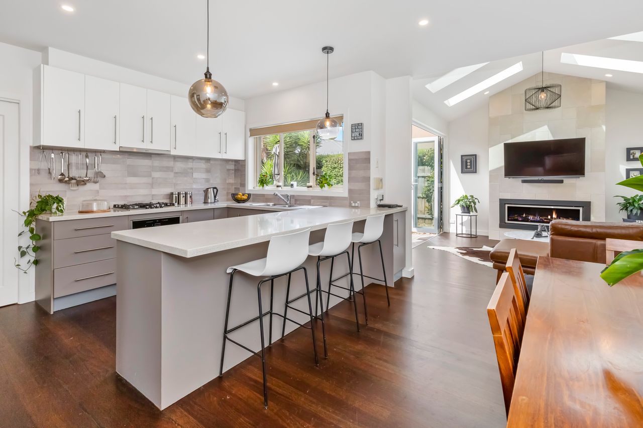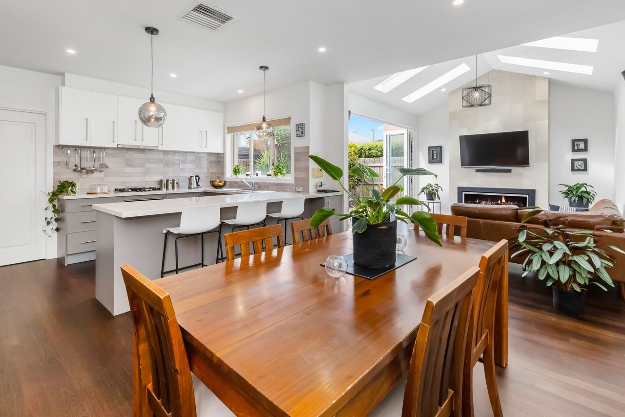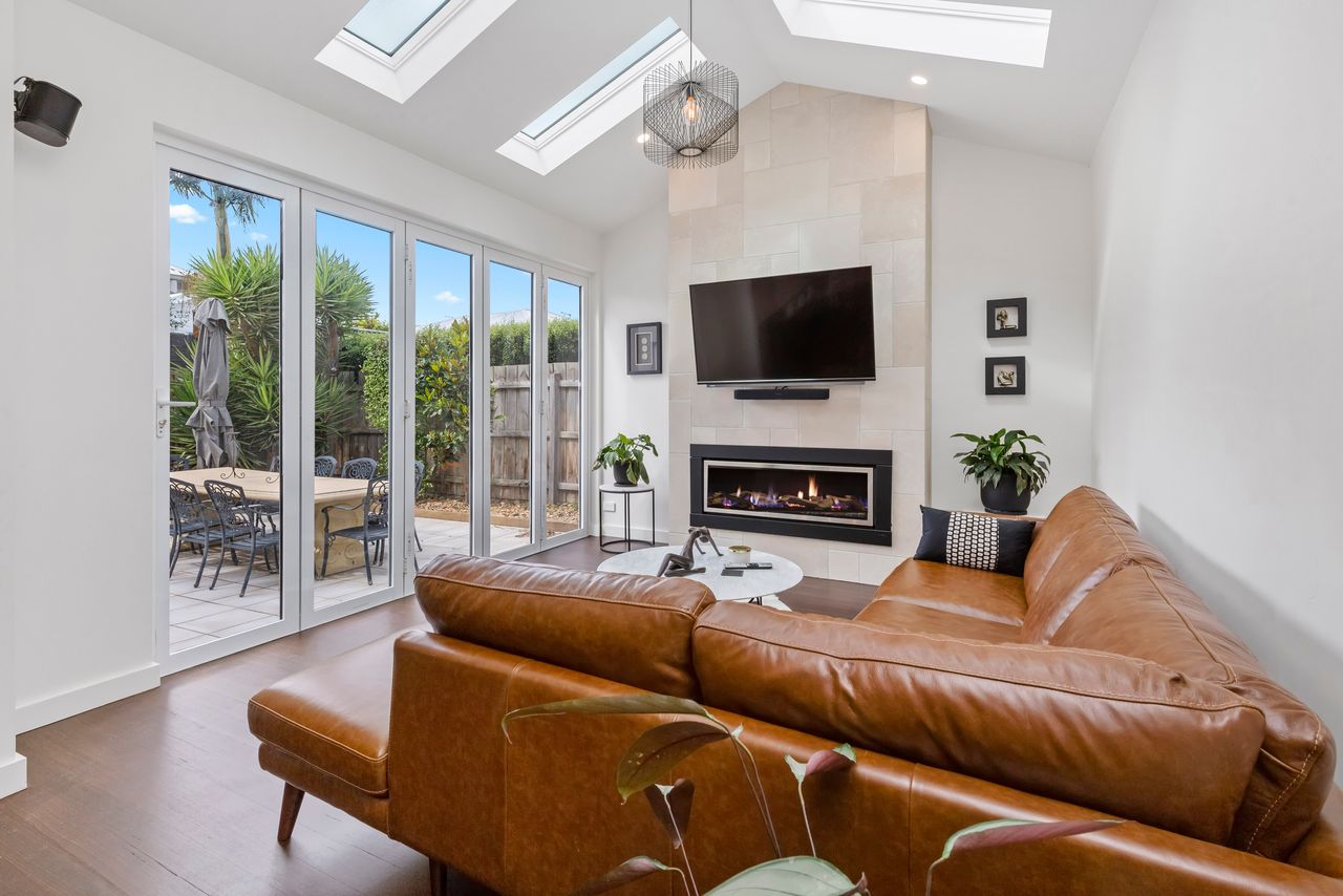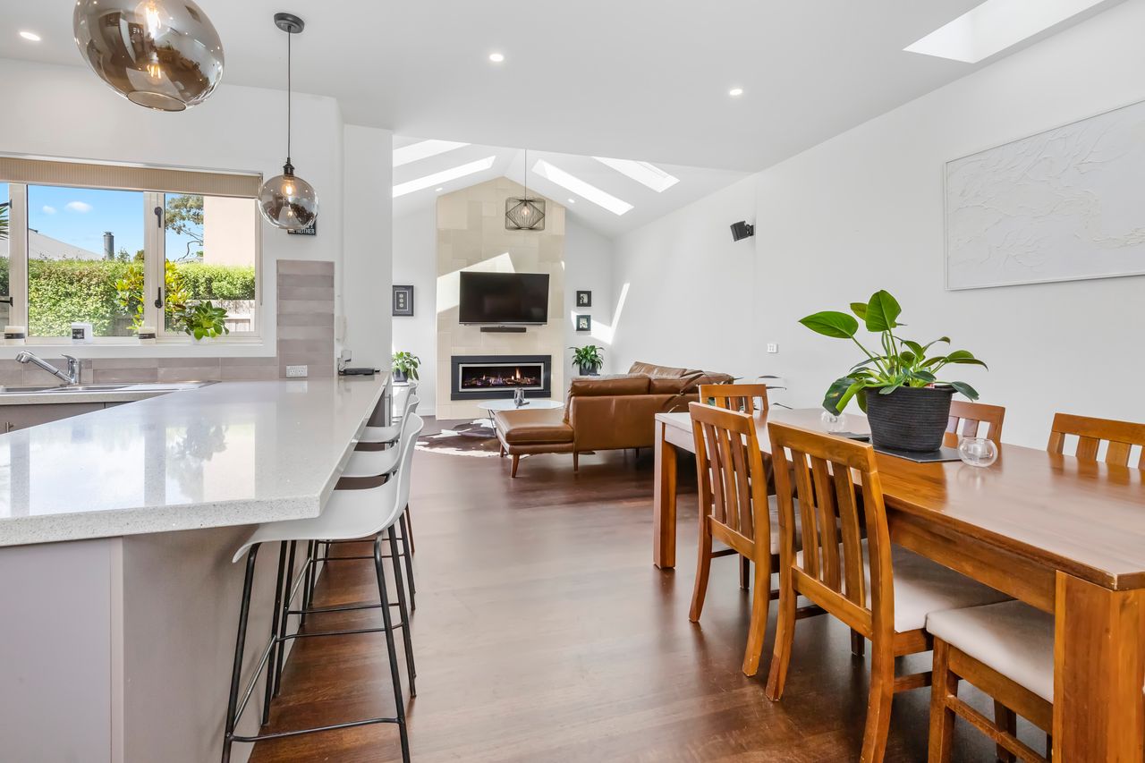 Celebrating the seaside lifestyle, the home boasts large entertaining spaces including a stunning, newly renovated lounge with leather sofa, gas-log fire and large TV, while an open-concept cooks kitchen includes quality appliances and a relaxed flow into the adjoining dining area and outdoor deck beyond.