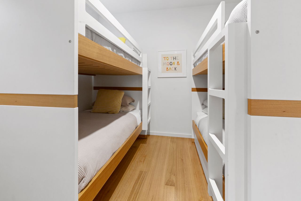 At the front of the house, in its own wing is a large king master bedroom with WIR and bathroom ensuite and a private sitting deck to enjoy the peaceful environment. Two other bedrooms are located at the rear of the house, both with BIR’s offering 1 x queen bed and 2 sets of single bunk beds. A secondary living space hosts a 4th bedroom inclusive of a single sofa bed, chaise lounge suite and TV which opens onto the deck. There is a central family bathroom with heated towel rails, separate powder room, and separate laundry with a drying cupboard.