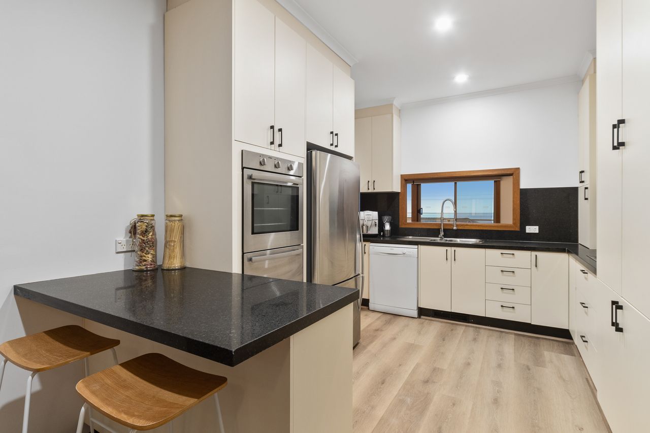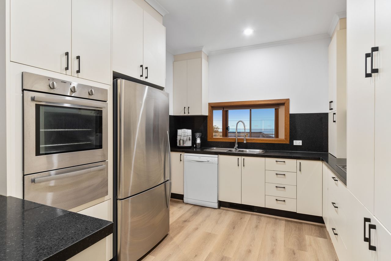 Upstairs you will find the expansive living and dining areas with picturesque views of the deep blue sea, the main bedroom with access to the balcony, walk in robe and full ensuite. A further two bedrooms are located on this level along with a central kitchen which features stainless steel appliances including dishwasher, electric cooking and is very well equipped with all the necessary appliances.