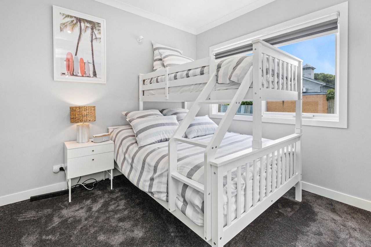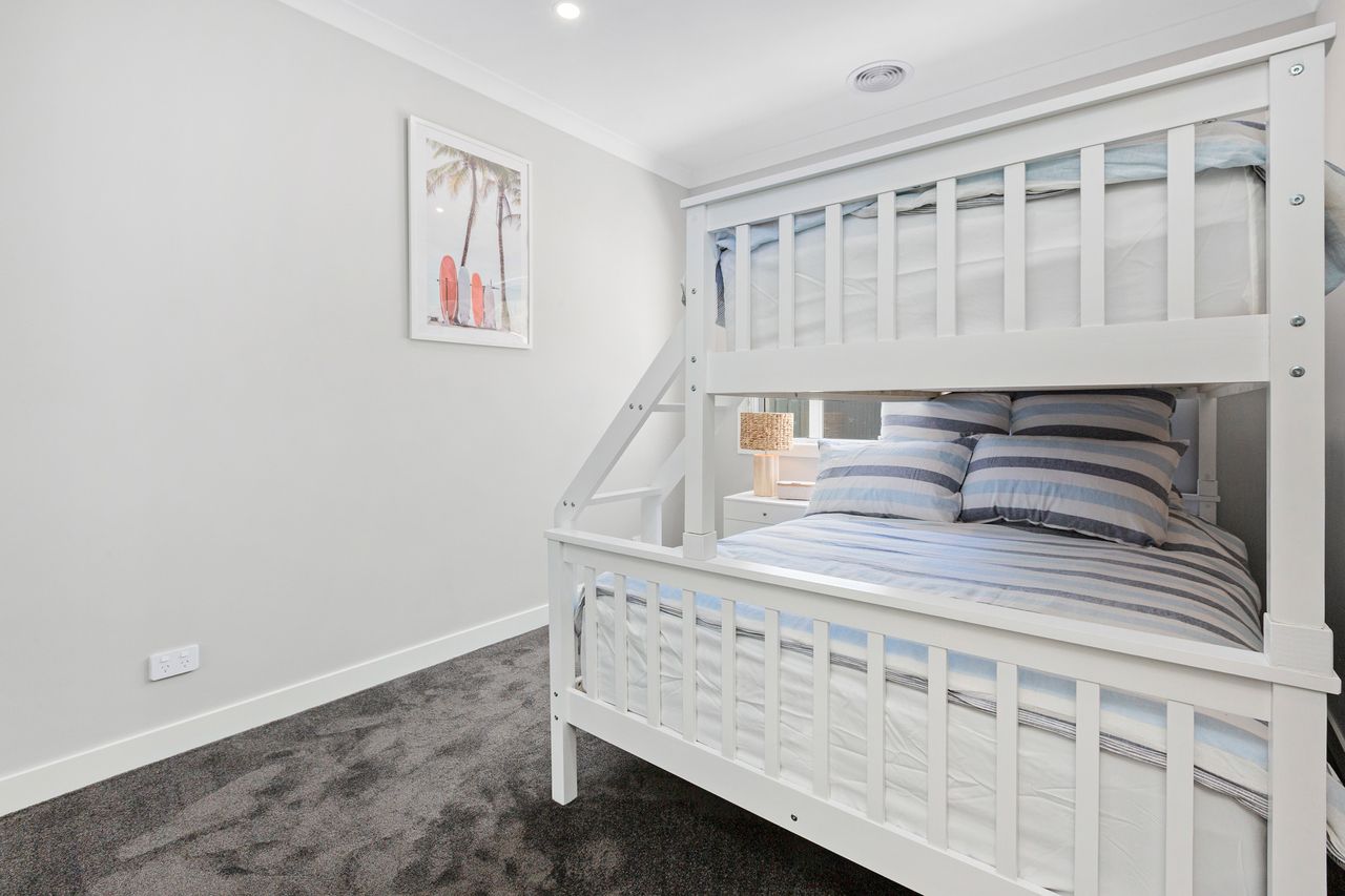 With bedrooms configured to sleep up to 10 people, accommodation includes a Queen bed in the master suite with walk-in robe and private ensuite, the second bedroom also offers a Queen bed, while two other bedrooms both provide bunks with a double bed on the bottom and single on top in the children’s wing, complete with a family bathroom with bath and shower.