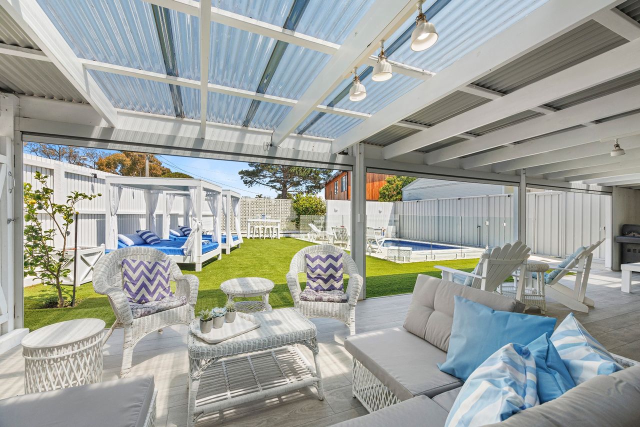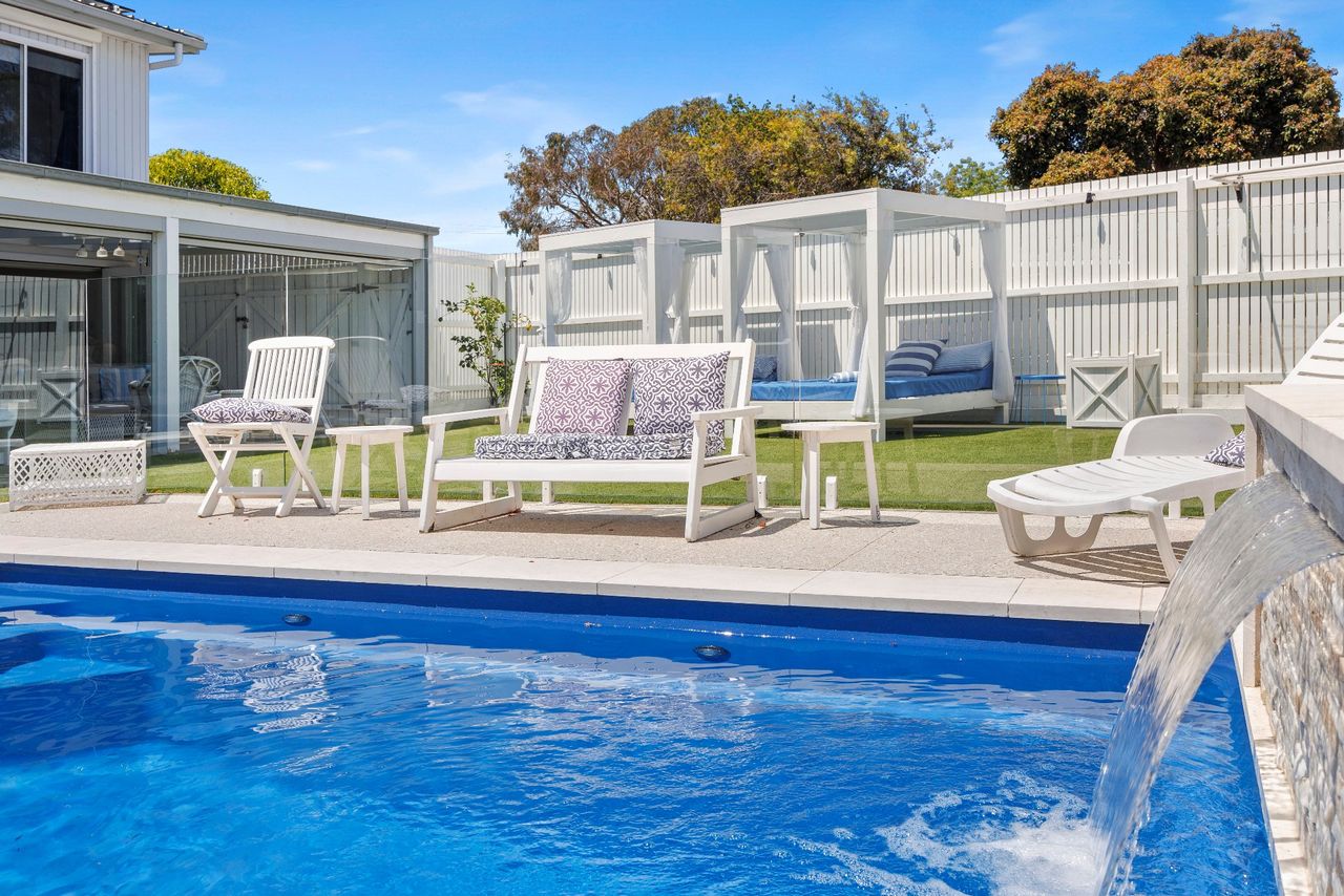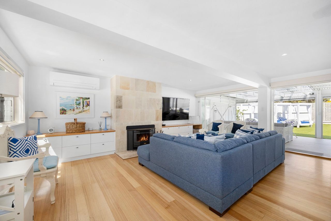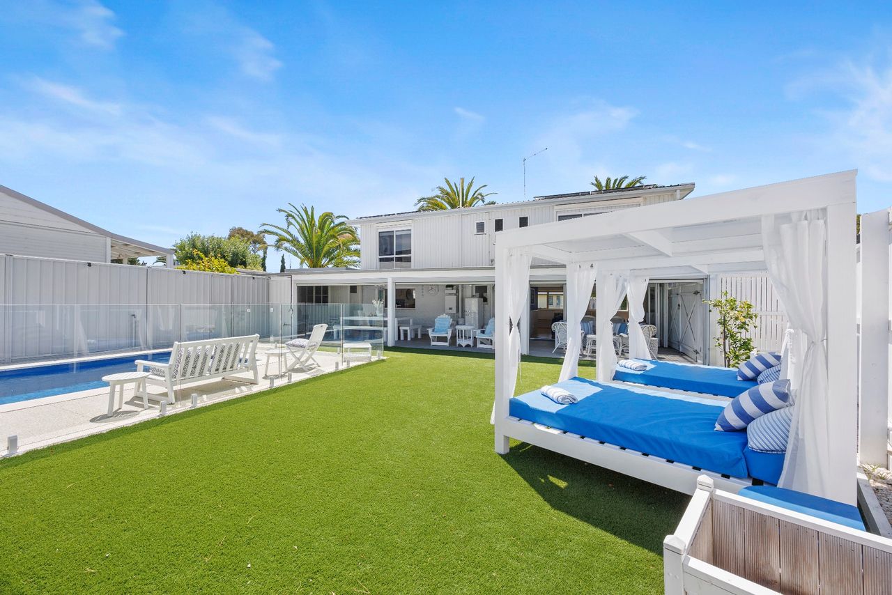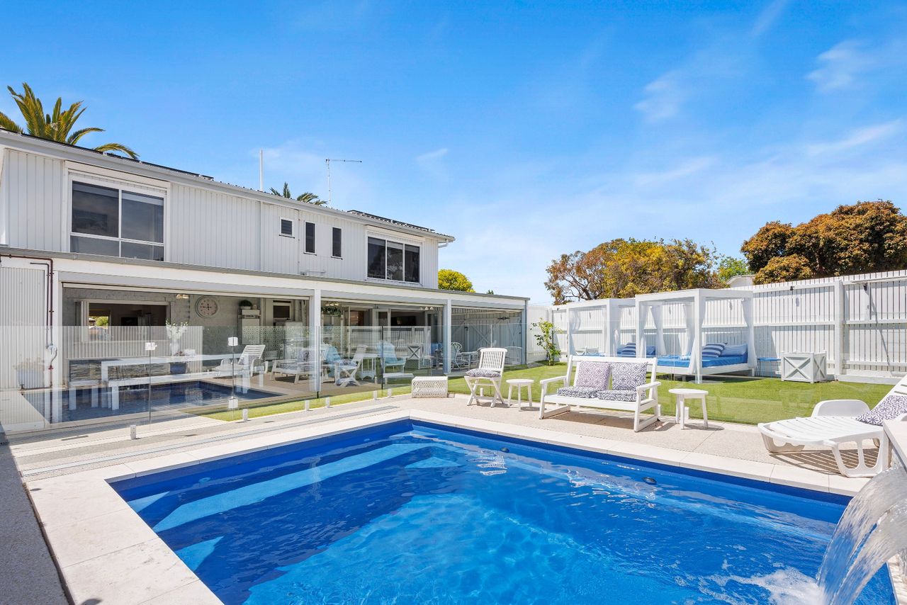 Perfect for families looking for a coastal getaway with stylish, new furnishings and a large yard, the home is just a 4 minute walk to the stunning foreshore and a short stroll to Safety Beach Country Club for those who enjoy a round of golf. With neutral tones complemented by splashes of vibrant blues, the inviting retreat includes 2 separate living zones with smart TVs, DVD players and comfortable sofas, bi-fold doors opening to a covered alfresco area with a gas barbecue and 10-seater outdoor table and a heated swimming pool behind glass balustrading with a sheet fountain that is spectacularly lit in the evenings.