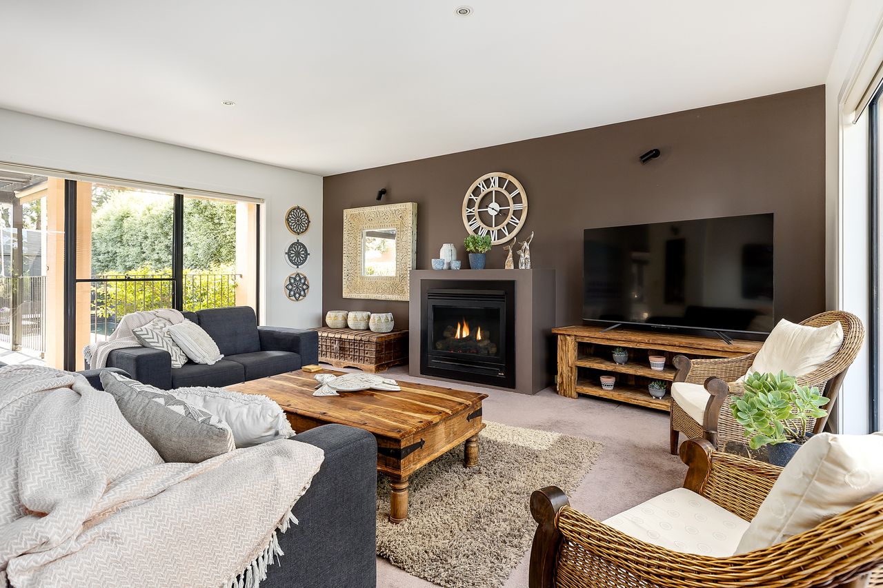 As well as a large laundry complete with second fridge. Downstairs is fully equipped for all weather conditions with both a log burning fireplace and reverse cycle air-conditioning for year-round comfort. Upstairs continues to impress with an additional 3 bedrooms, including a spacious master offering tranquil farming views and serviced by modern luxury bathroom and ensuite. Another large lounge area complete with board games, books and a large screen TV sits central to the bedrooms again with air-conditioning and ceiling fans for airflow. The upstairs lounge opens through large sliding doors onto a balcony offering spectacular open plains views to relax by in the evenings. Your every comfort is addressed by this impressive property from complimentary Netflix, a solar-heated pool and 3 large screen TVs to a main bathroom spa bath and quality comfort beds and couches throughout.