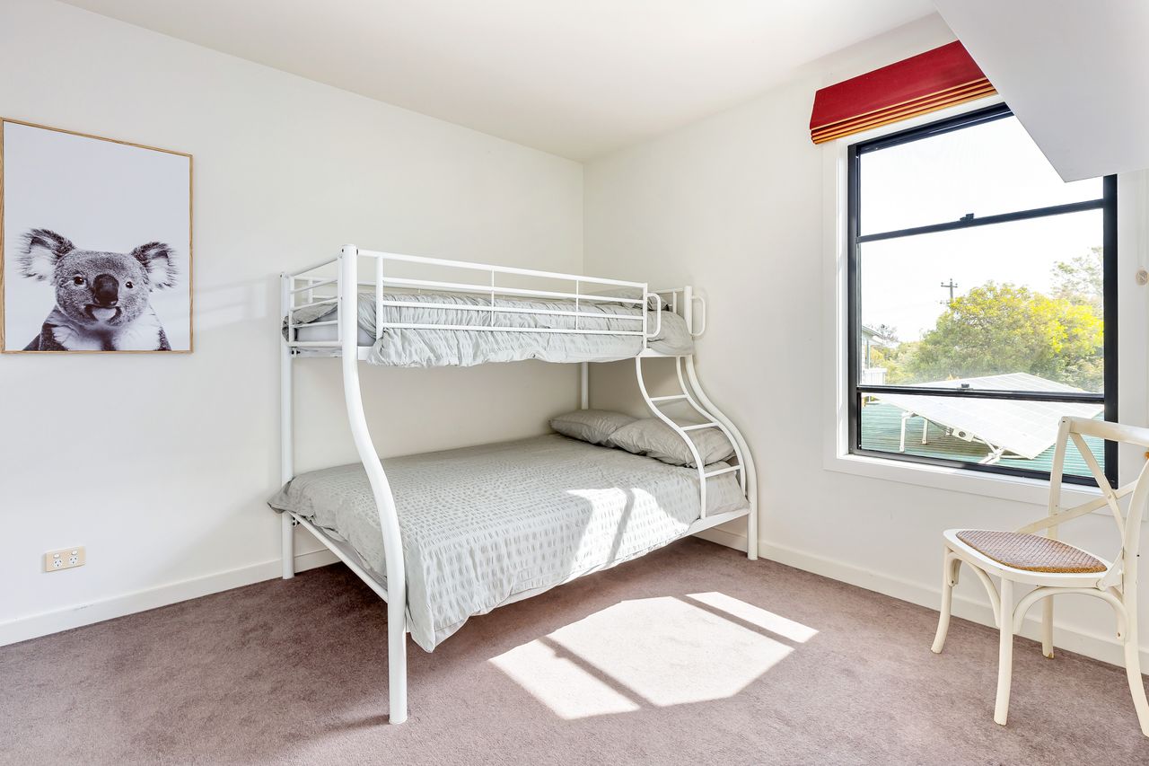 The interior is split across two levels with the lower consisting of the main living/dining/kitchen areas which conveniently connect on both sides to the outdoor alfresco areas. The kitchen is impressive to say the least, offering an abundance of bench space for preparing a feast and equipped with high-end appliances to meet your every need, overlooking a sizeable dining room boasting a 10-seater dining table. One bedroom is positioned downstairs, fully air-conditioned with a queen bed, ceiling fan and with its own entrance to the poolside pergola.