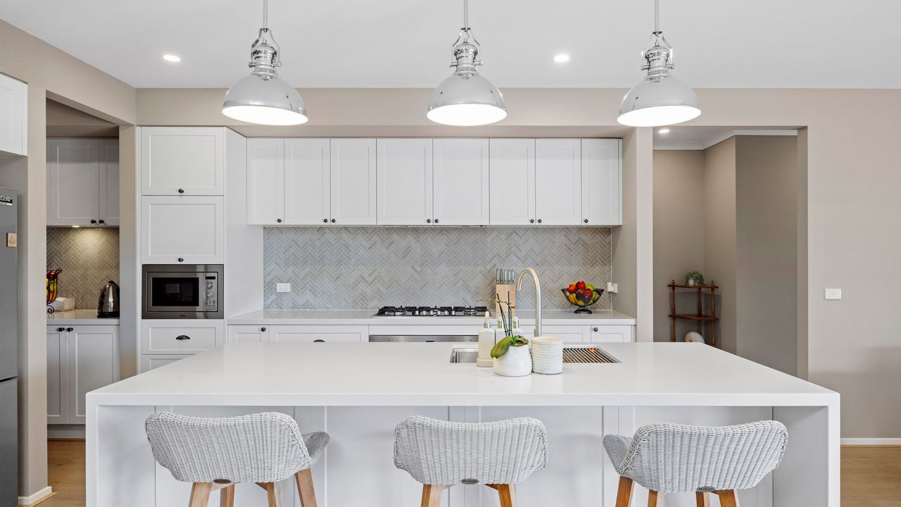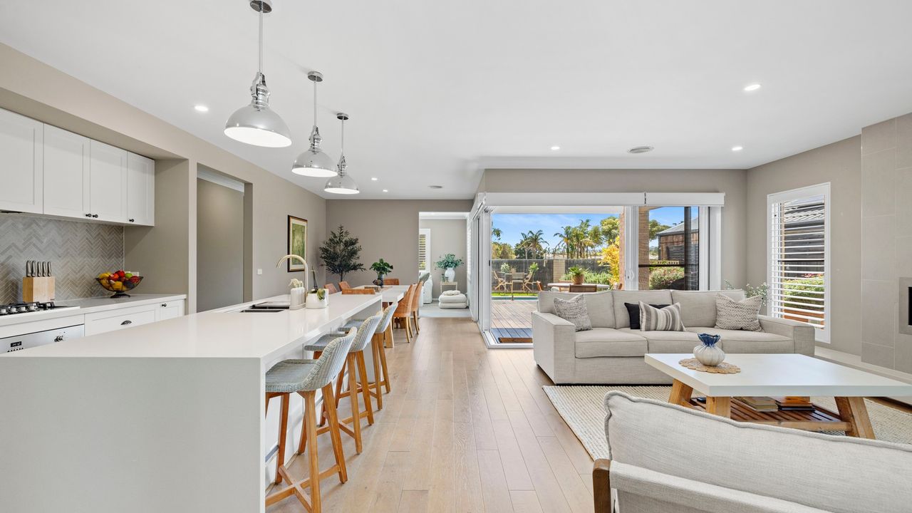 At the heart of the home is a beautifully appointed kitchen with stone benchtops, premium appliances, and a generous walk-in pantry perfect for cooking, entertaining, or enjoying a slow breakfast before heading to the beach.