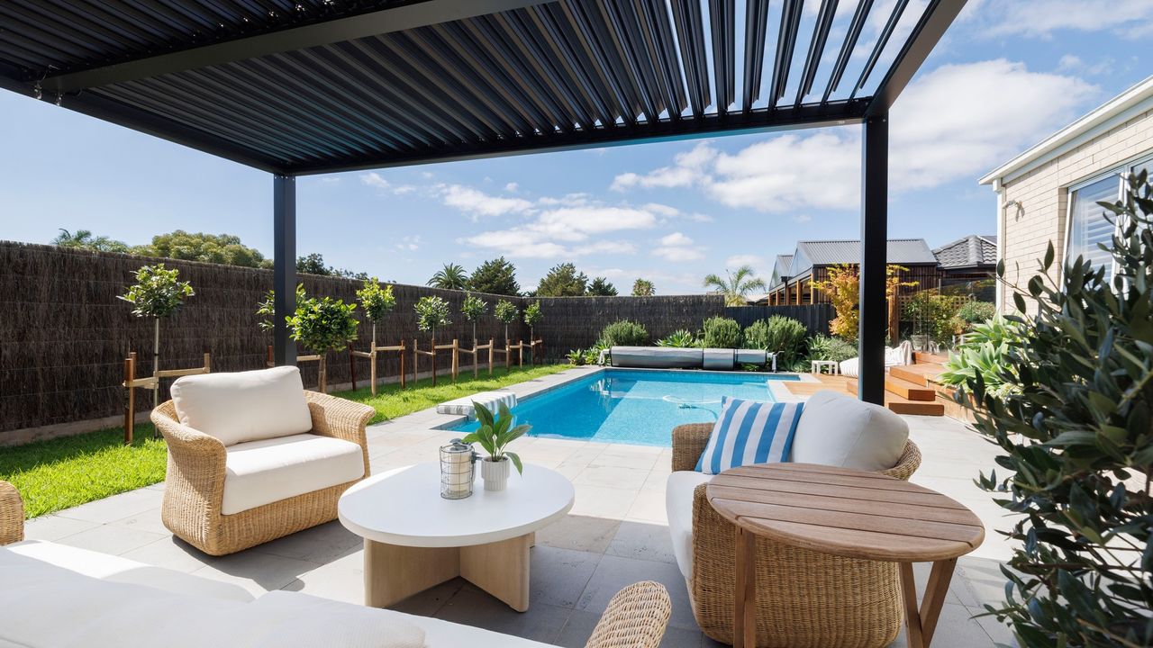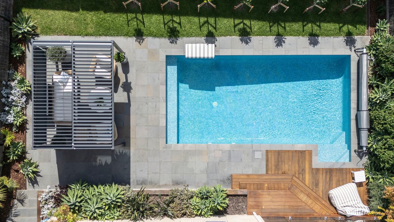 A beautifully designed poolside pergola offers adjustable shade over a comfortable lounge area, making it an ideal spot to relax with a book or enjoy a quiet drink. Surrounded by lush, landscaped gardens, this serene outdoor retreat is perfect for summer evenings, sunset drinks, and long, lazy afternoons by the pool